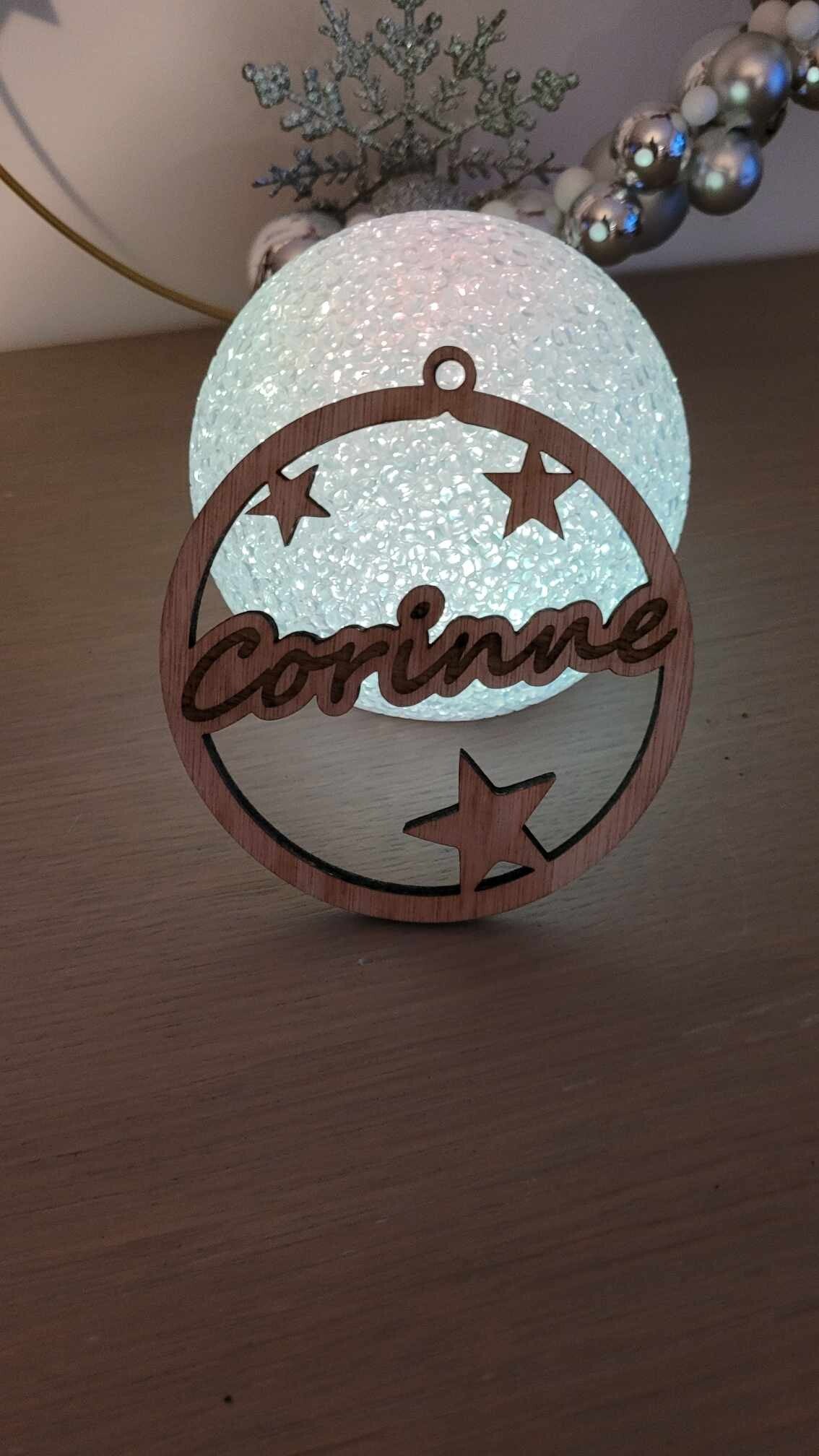 Décorez votre sapin avec une boule en bois découpée au prénom de votre choix, agrémentée de petites étoiles pour une touche festive et moderne.