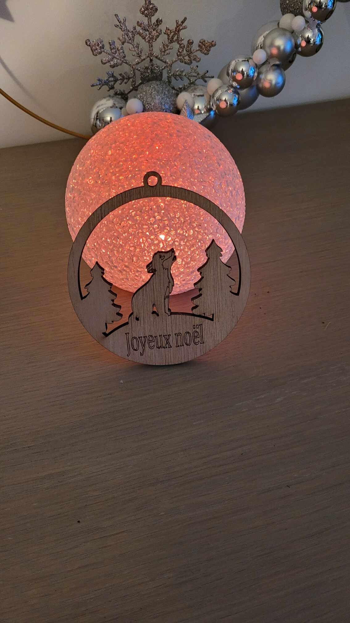 Boule de Noël en bois découpée au laser, illustrant un loup hurlant sous la lune, entouré de sapins et de l’inscription "Joyeux Noël".