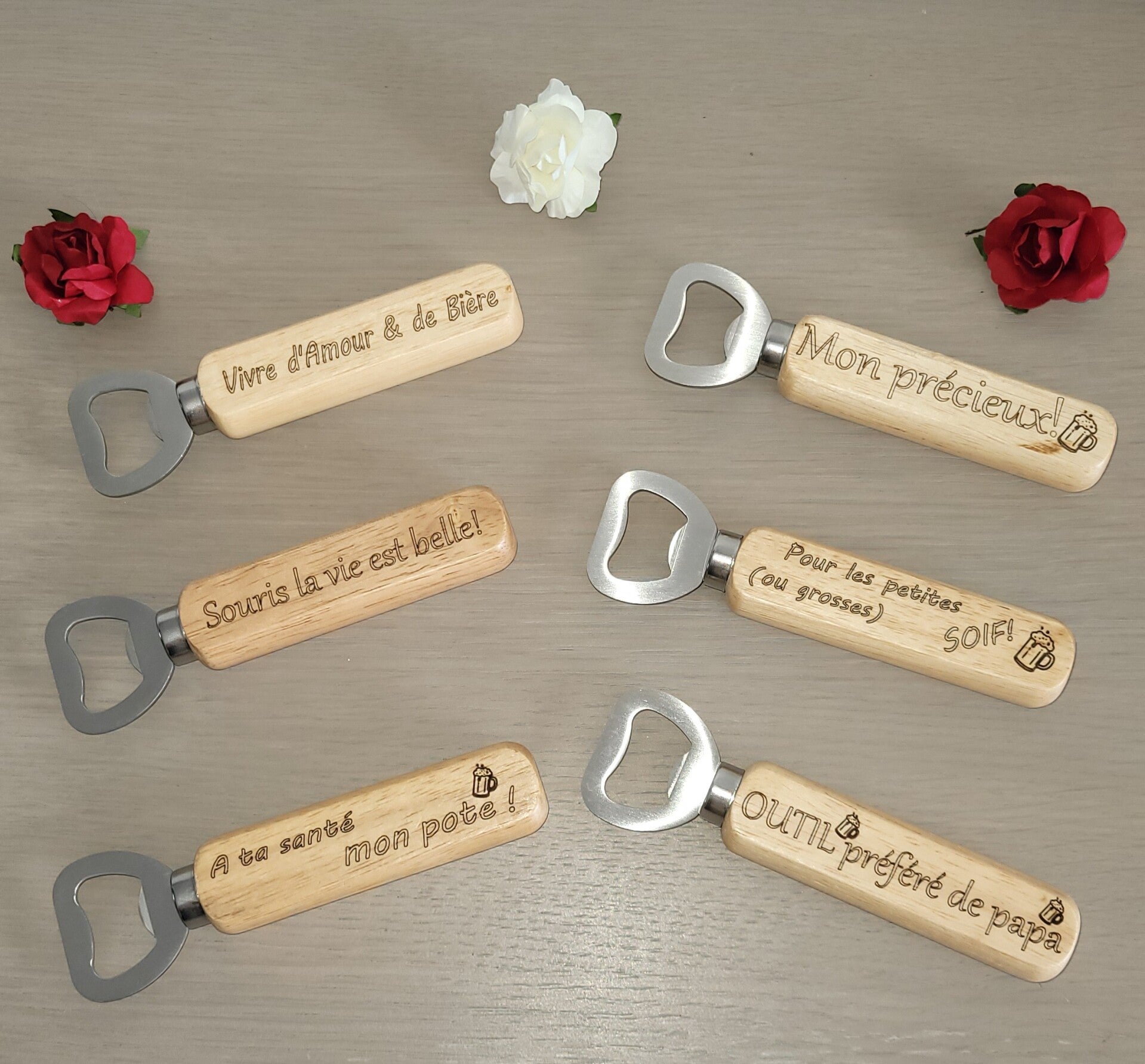 Découvrez nos décapsuleurs artisanaux au manche en bois gravé, parfaits pour faire sourire à chaque apéritif !