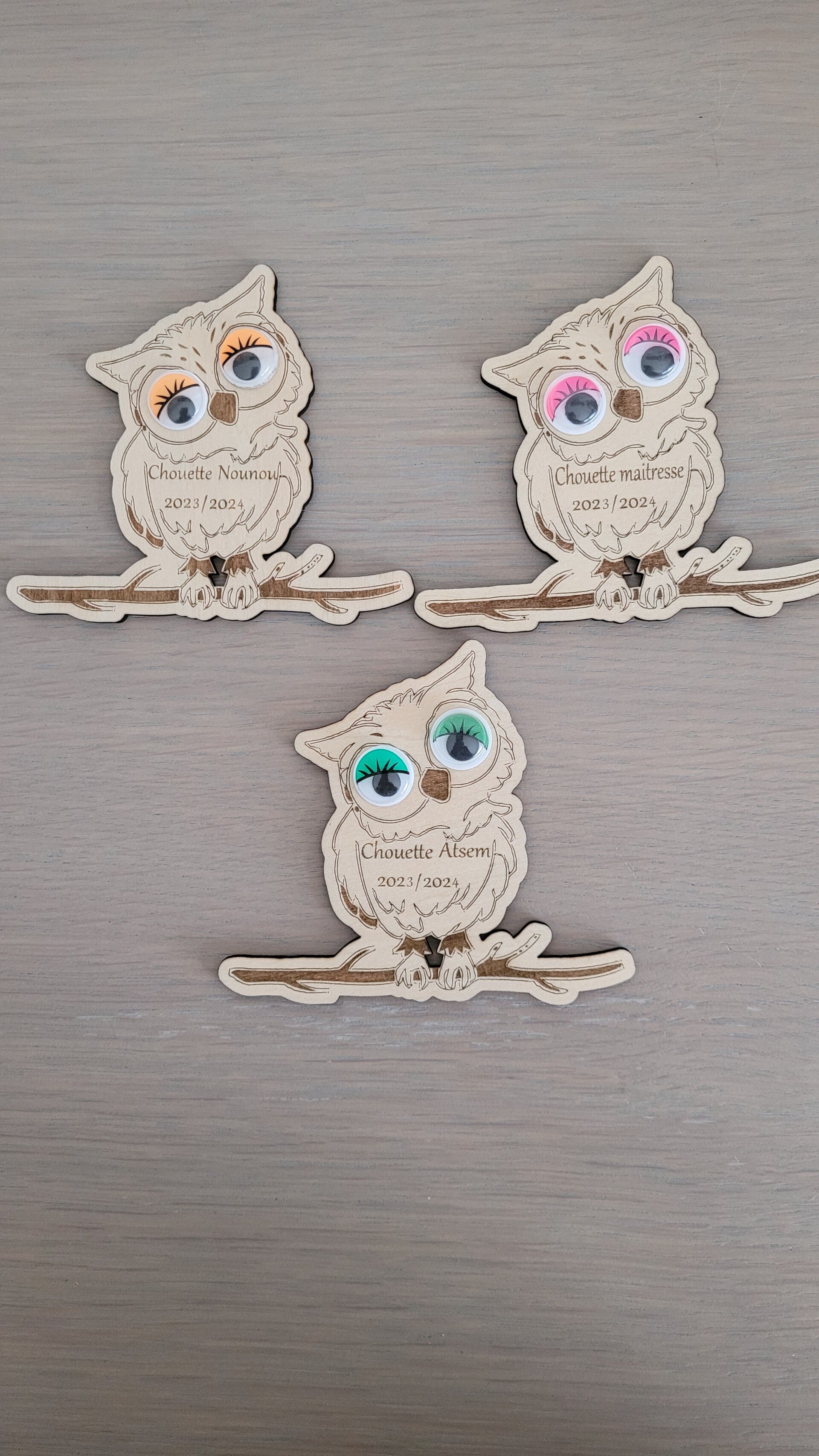 Ces adorables magnets en forme de chouette sont gravés au laser avec soin puis personnalisés avec des yeux expressifs et des inscriptions comme "Chouette maîtresse", "Chouette nounou", etc.