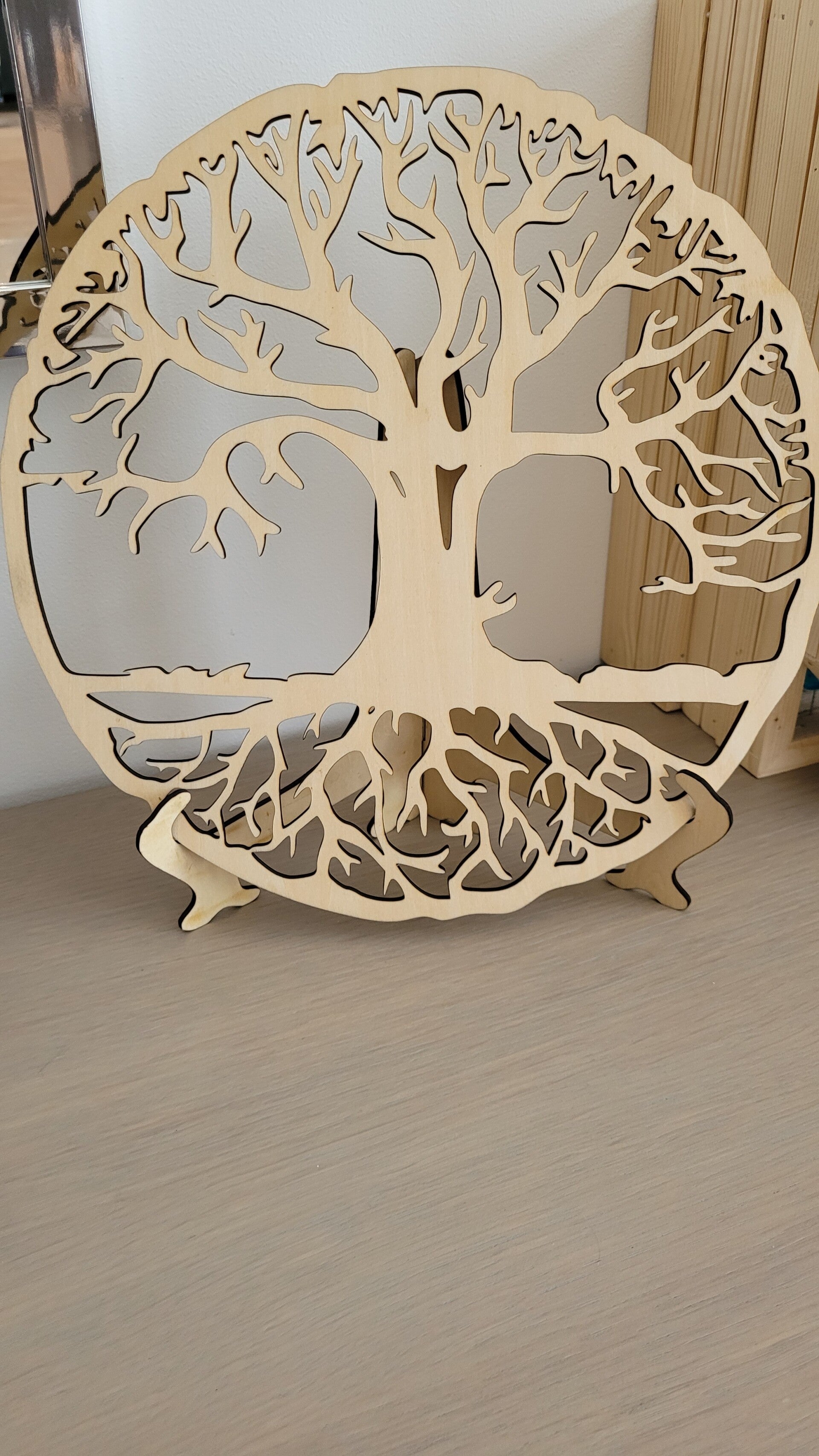 Arbre de vie décoratif en bois naturel – diamètre 30 cm, livré avec son chevalet support.