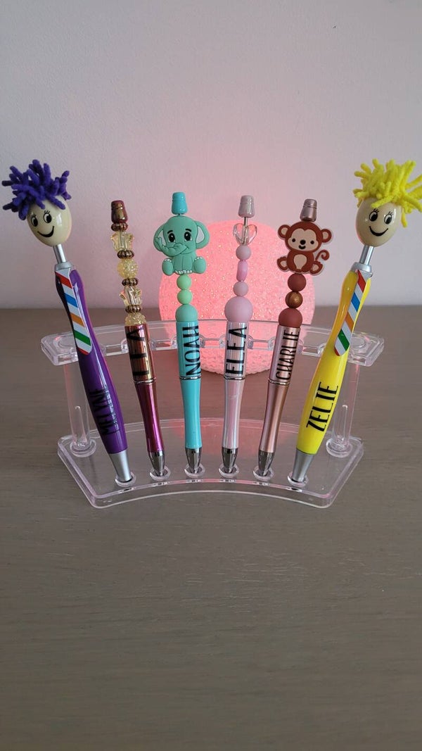 Chaque stylo est décoré à la main avec des perles fantaisie, figurines ou pompons, et personnalisé avec un prénom en vinyle (découpe Cricut).