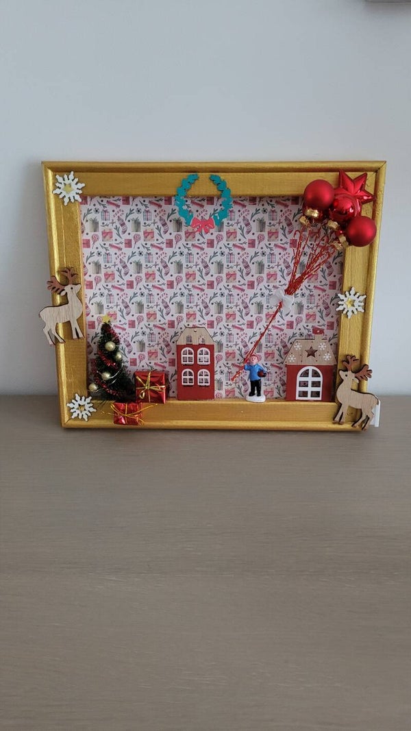 Ce cadre original mesure environ 30 x 25 cm et est décoré à la main avec des éléments festifs : maisons en bois, sapin décoré, rennes, boules de Noël et guirlande lumineuse intégrée (LED).