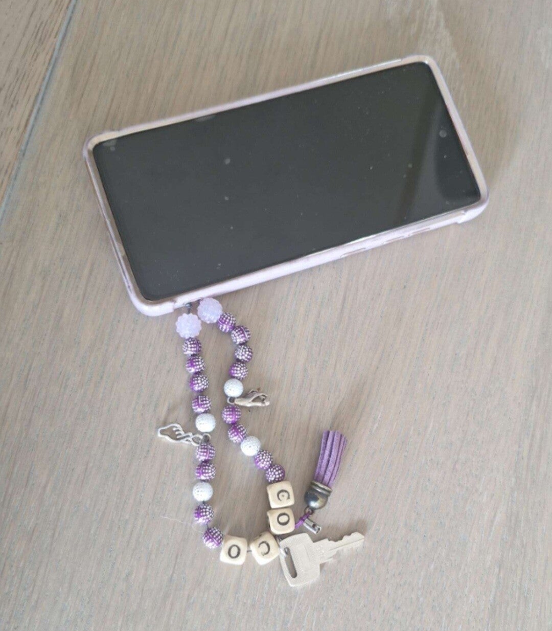 Ajoutez une touche de fantaisie à votre téléphone avec ce bijou original fait main 💜 Composé de perles colorées et de petites pampilles décoratives, il s’attache facilement à votre coque pour accessoiriser votre mobile avec style.
