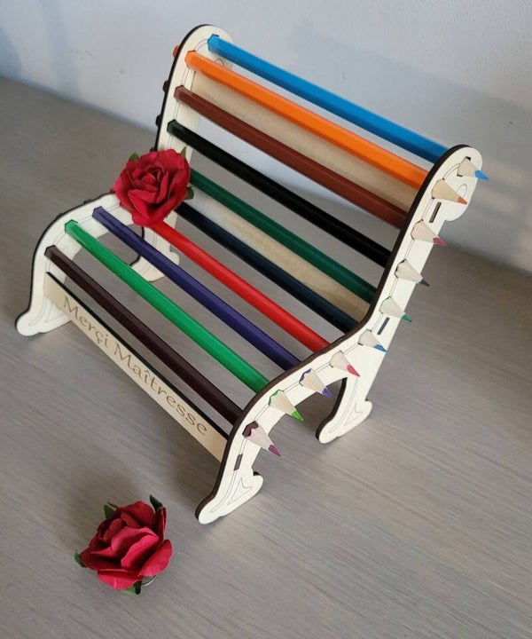 📚 Offrez ou offrez-vous ce magnifique banc à crayons artisanal en bois de balsa naturel, spécialement gravé au laser avec l'inscription Merci Maîtresse , merci maître, nounou , atsem ou même avec votre prénom !