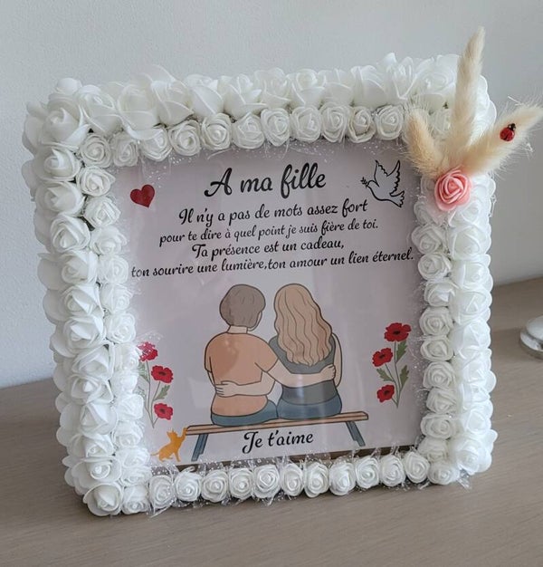 Ce cadre de 20x20 cm est décoré à la main avec des fleurs en mousse blanches et rouges, et une illustration personnalisée imprimée avec soin.