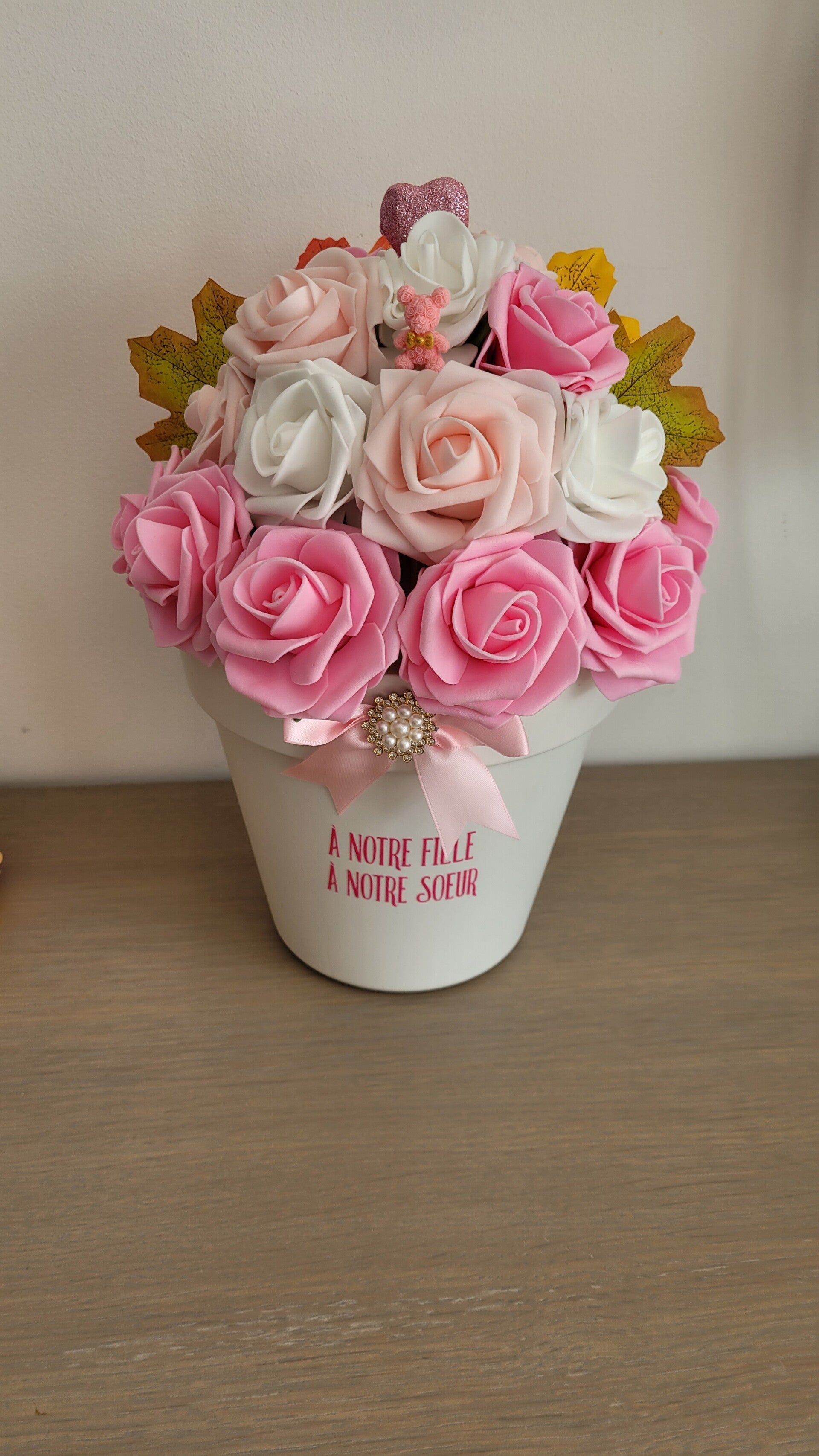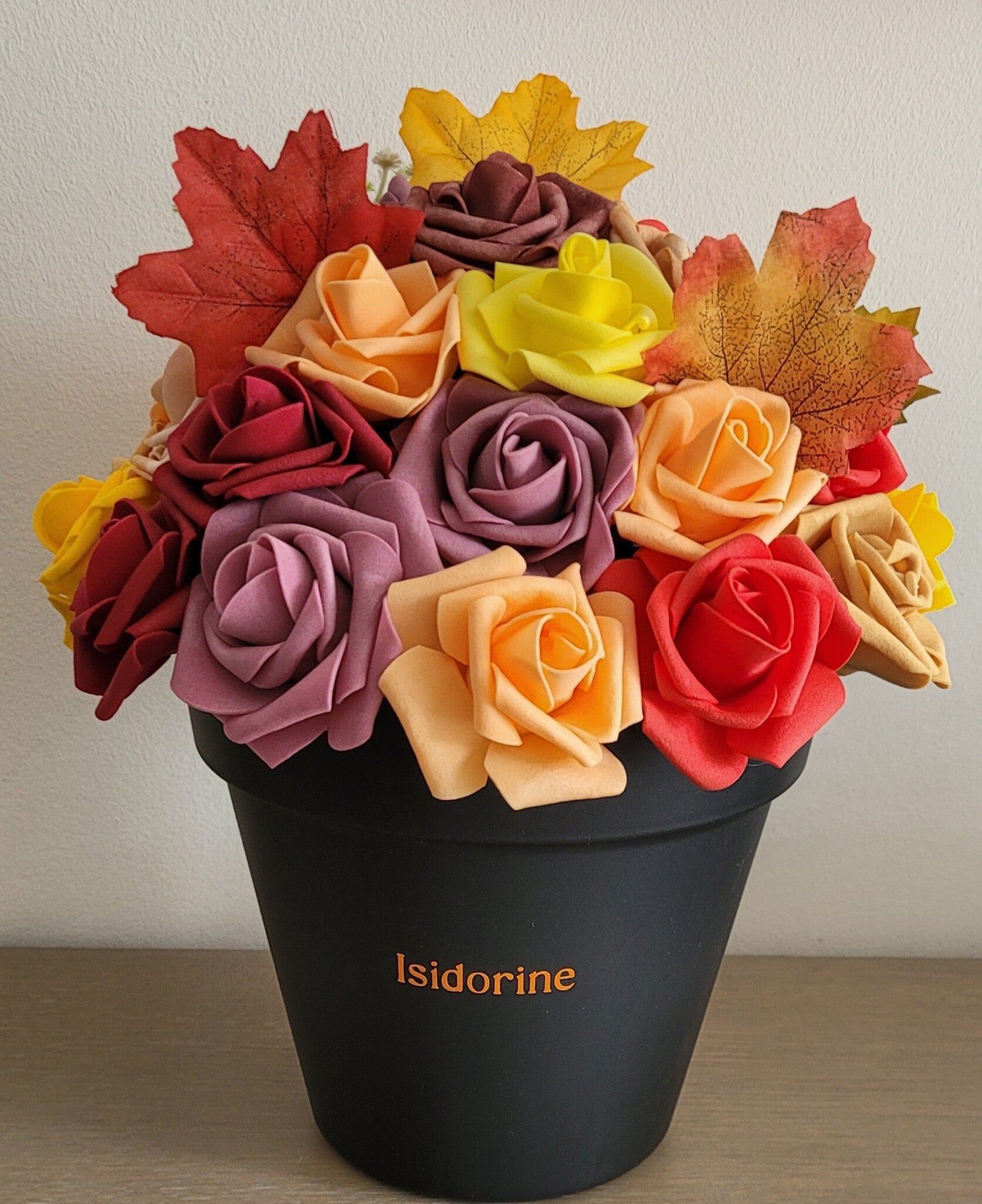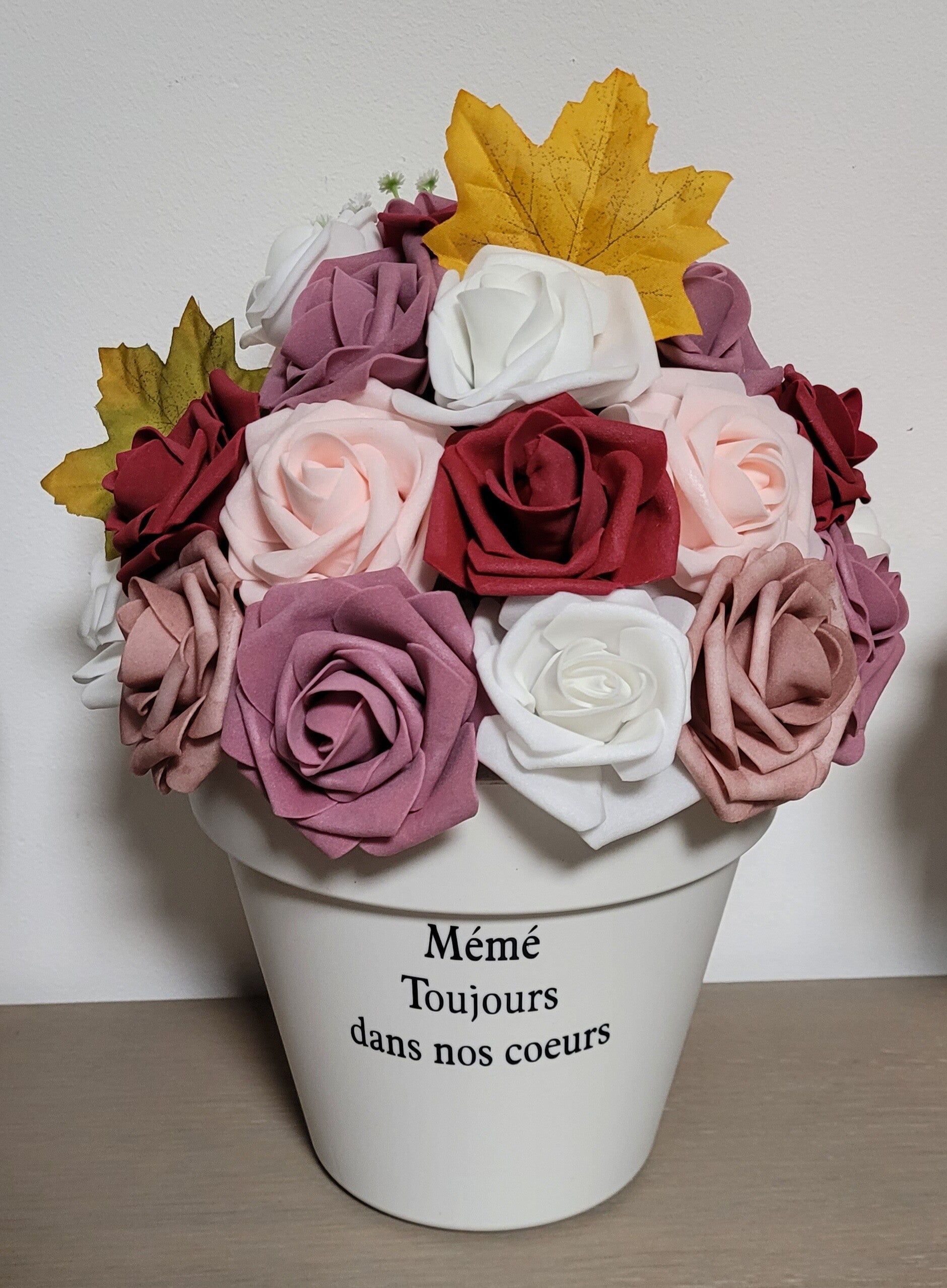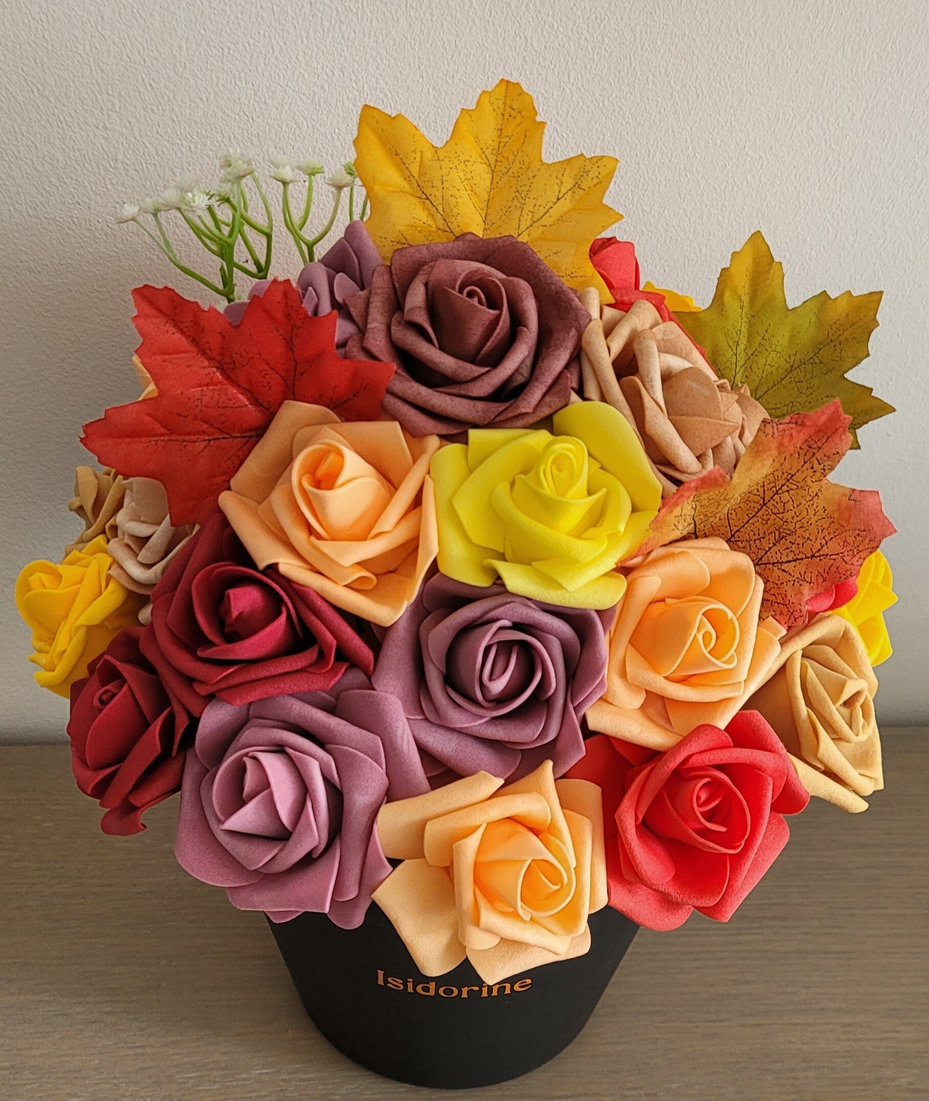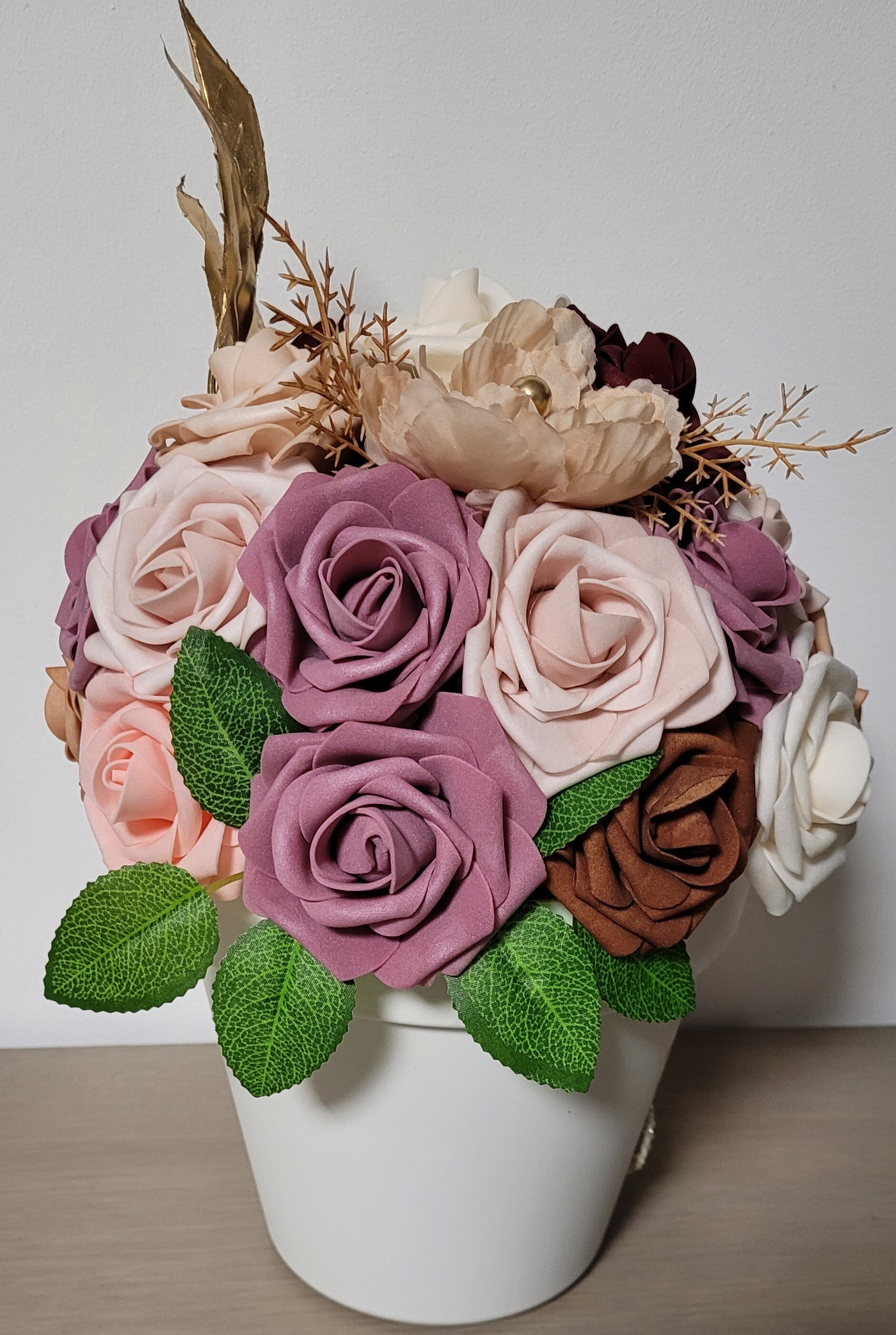 Cette composition artisanale a été réalisée avec soin en fleurs de mousse EVA. Contrairement aux fleurs naturelles, elles ne fanent pas et conservent leur éclat dans le temps.