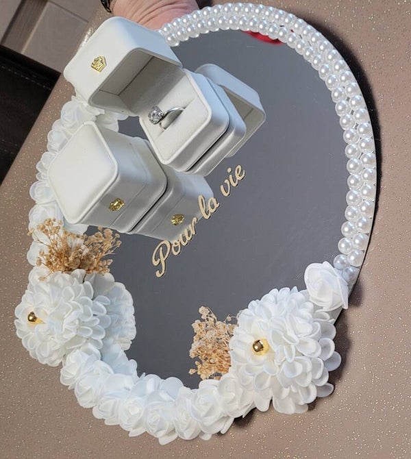 Sublimez l’échange de vos alliances avec ce support miroir décoré de fleurs blanches, perles et détails dorés. Élégant et raffiné, il apportera une touche de romantisme et d’originalité à votre cérémonie de mariage.