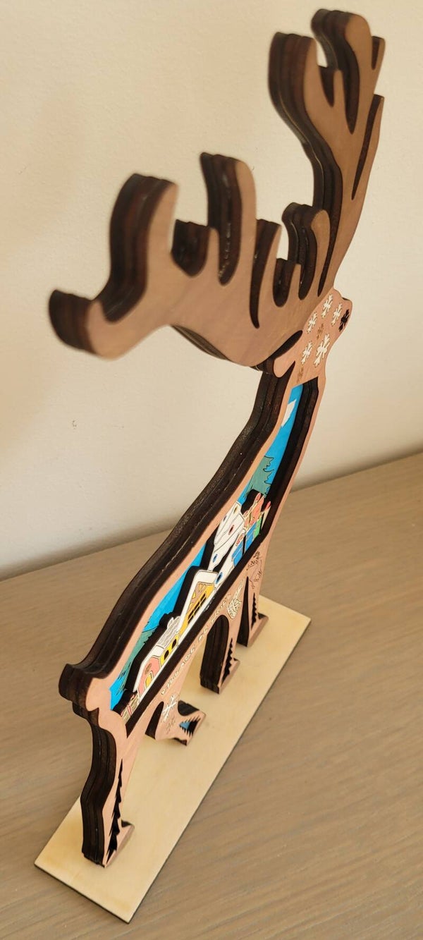 Renne en bois découpé au laser, composé de 3 couches superposées pour un joli effet 3D. Chaque élément est peint à la main, puis assemblé avec soin.
