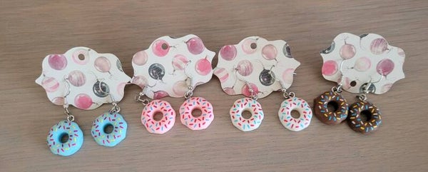 Chaque paire est assemblée par mes soins à partir d’éléments décoratifs : macarons, donuts ou petites boules transparentes remplies de paillettes multicolores.
