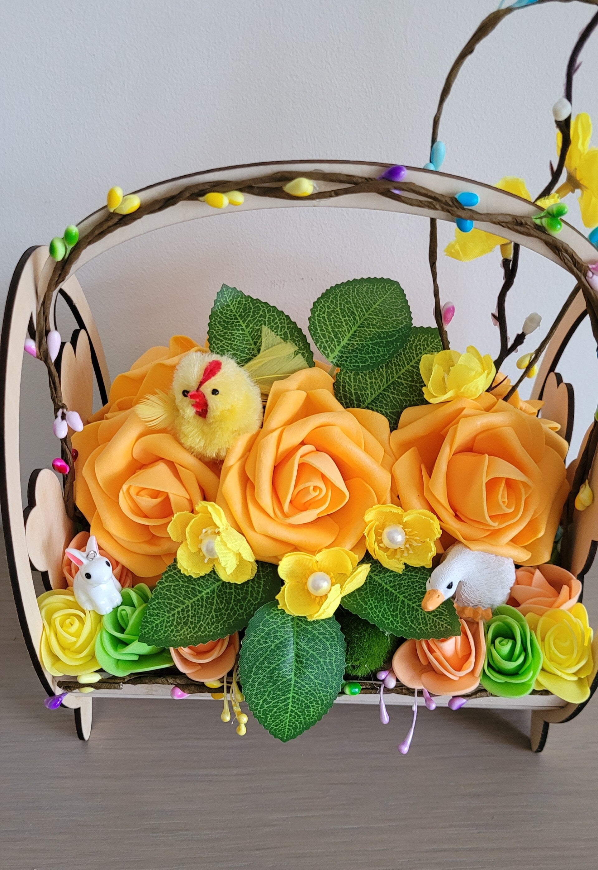 Le panier a été découpé au laser puis monté à la main avant d’être décoré avec des fleurs en mousse aux couleurs printanières et différents éléments décoratifs sur le thème de Pâques. Les petits détails et les couleurs douces en font une décoration idéale pour célébrer le printemps ou offrir un cadeau original.