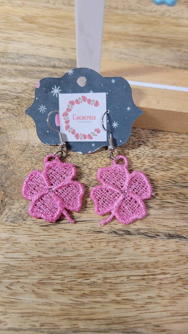 Boucles d’oreilles fantaisie en forme de trèfle, entièrement brodées avec un fil fin et délicat.