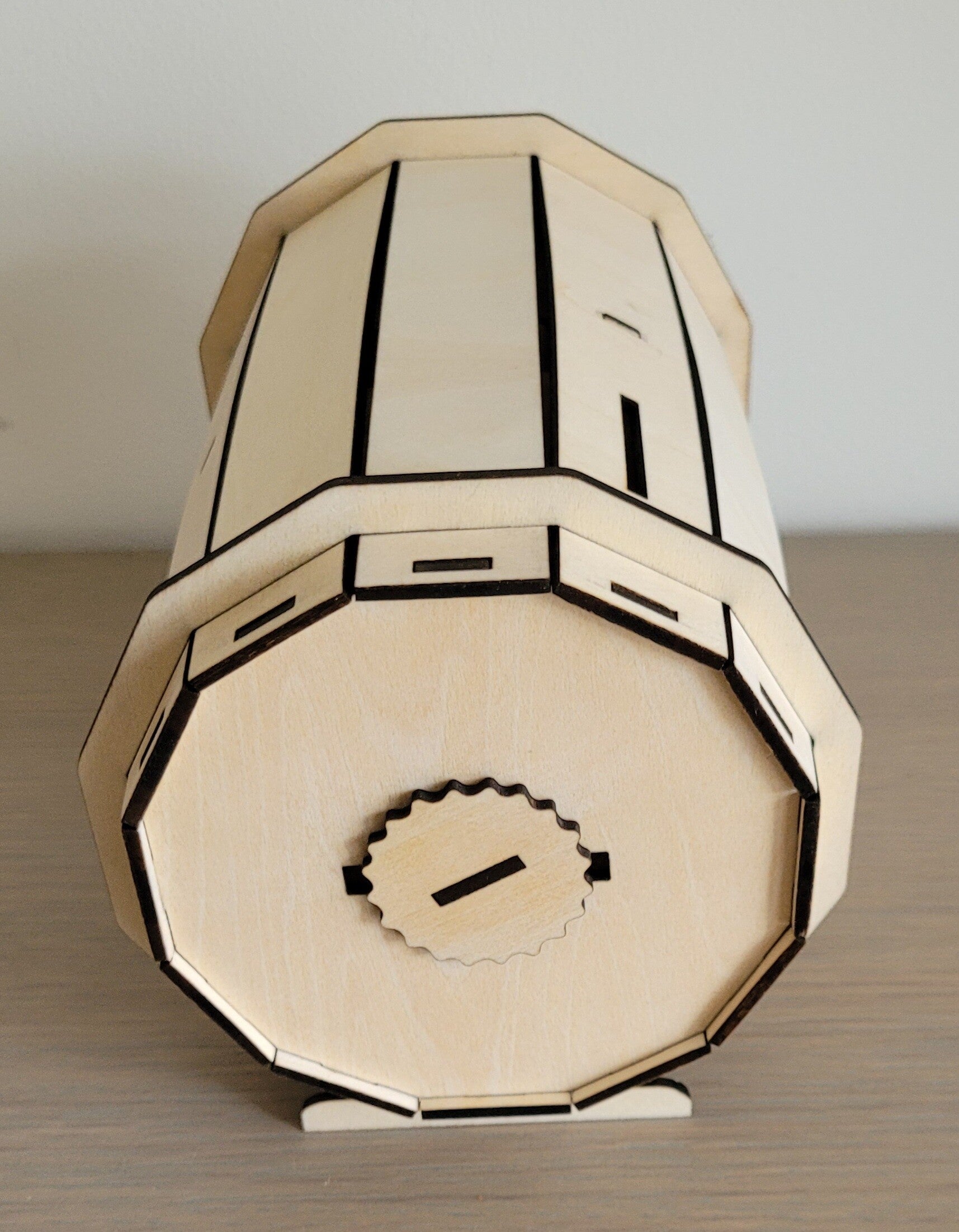 Apportez une touche authentique et originale à votre décoration avec cette tirelire en forme de tonneau, réalisée en bois découpé et gravé au laser.