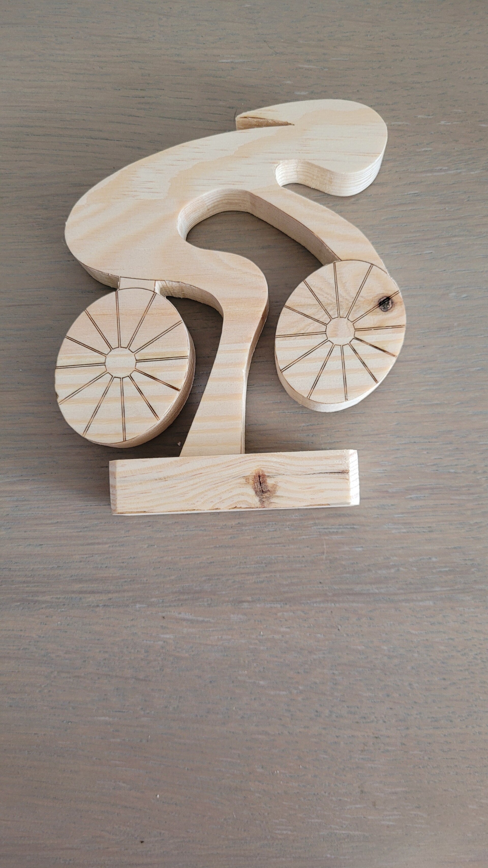 Cette création artisanale est découpée avec précision à la scie à chantourner dans un bois de 18 mm d’épaisseur, puis soigneusement poncée pour obtenir une finition douce et naturelle. Les roues sont gravées pour un effet décoratif élégant.