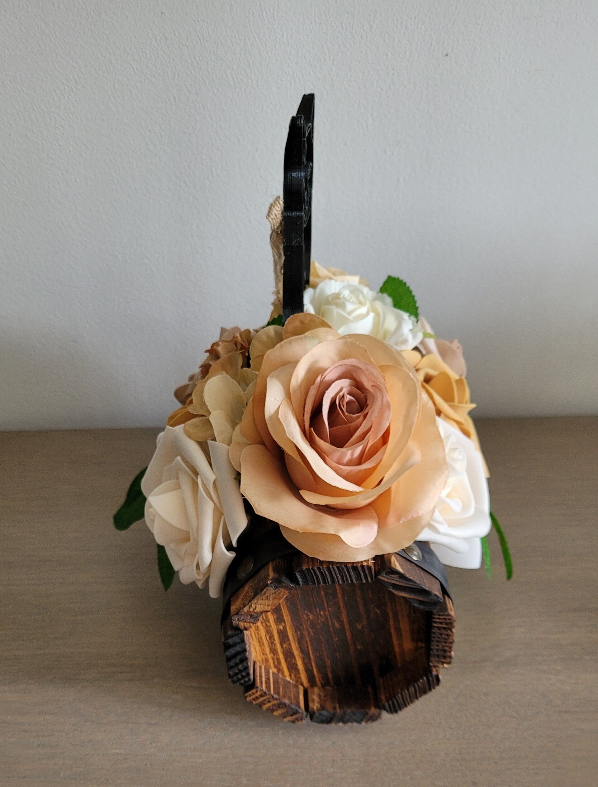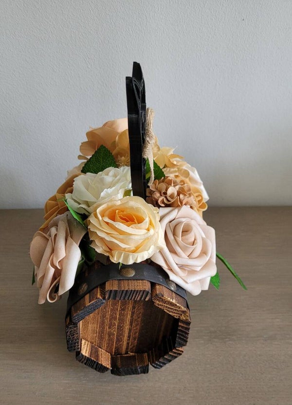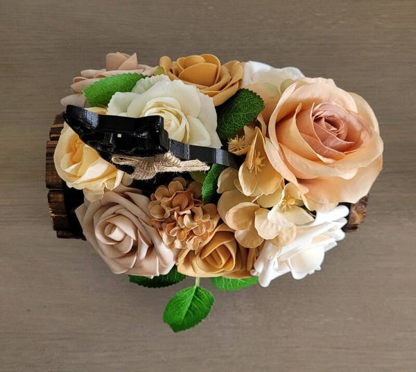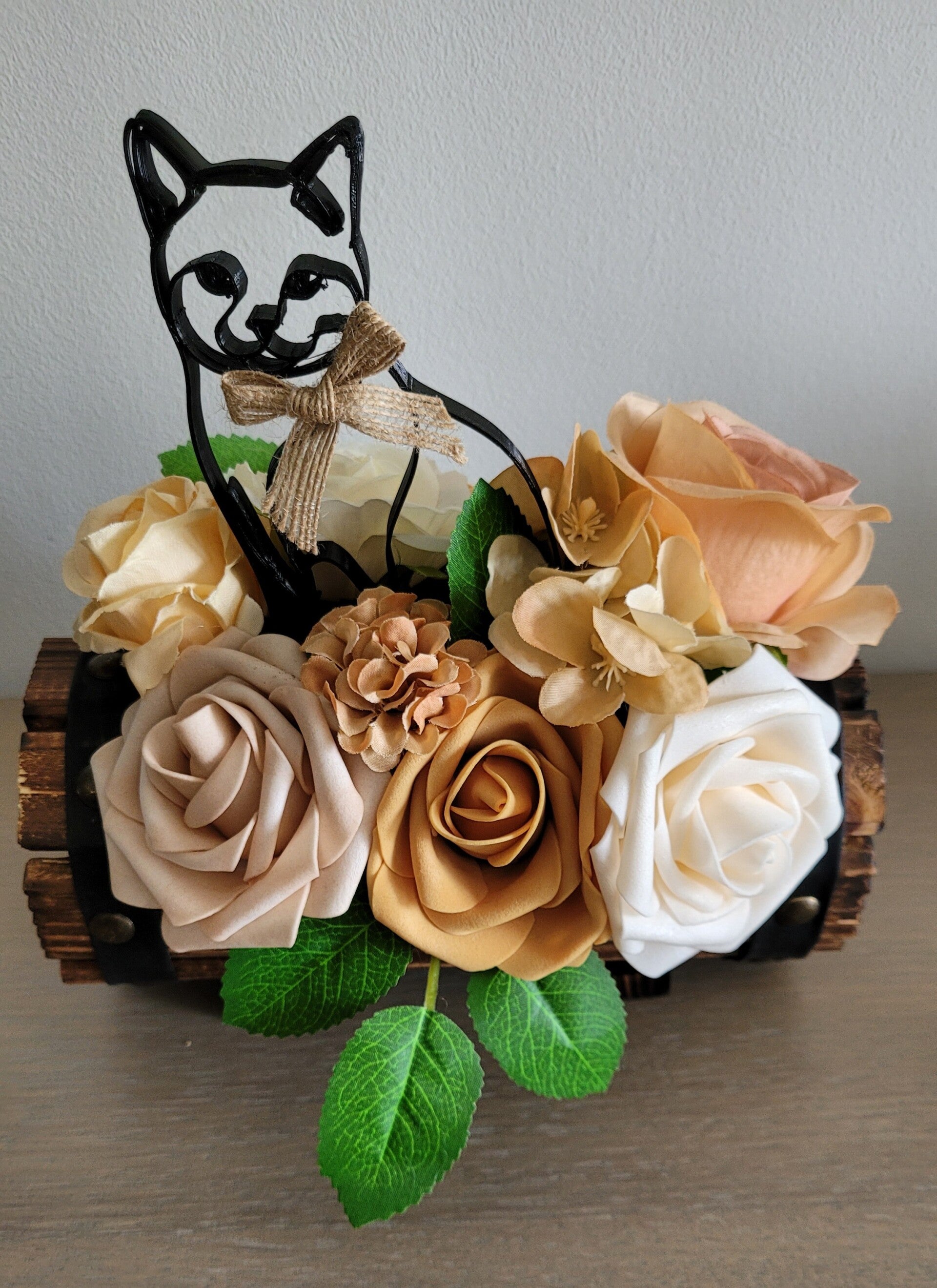 Chaque pièce est réalisée avec soin : le tonneau en bois apporte un côté naturel et chaleureux, tandis que les fleurs en mousse offrent un rendu réaliste, durable et sans entretien. Le petit chat en impression 3D vient compléter l’ensemble avec une touche originale et moderne.