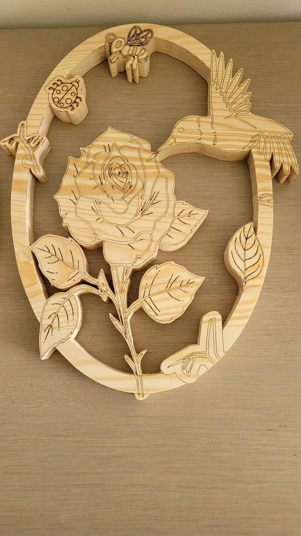Décoration murale en bois avec motif rose ou colibri, réalisée avec soin pour un rendu élégant et naturel ✨