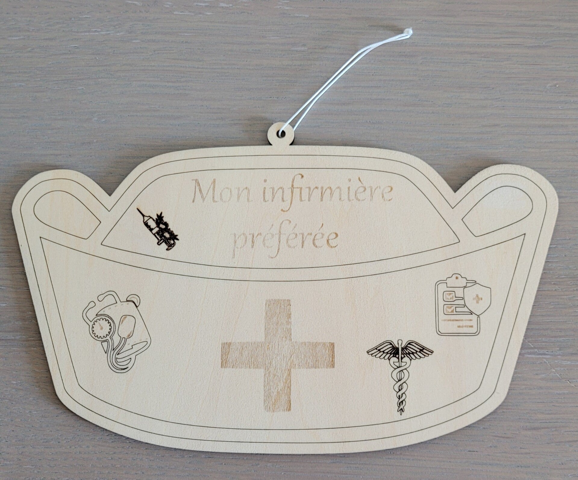 Plaque décorative en bois représentant une coiffe d’infirmière, réalisée avec soin et gravée avec un message.