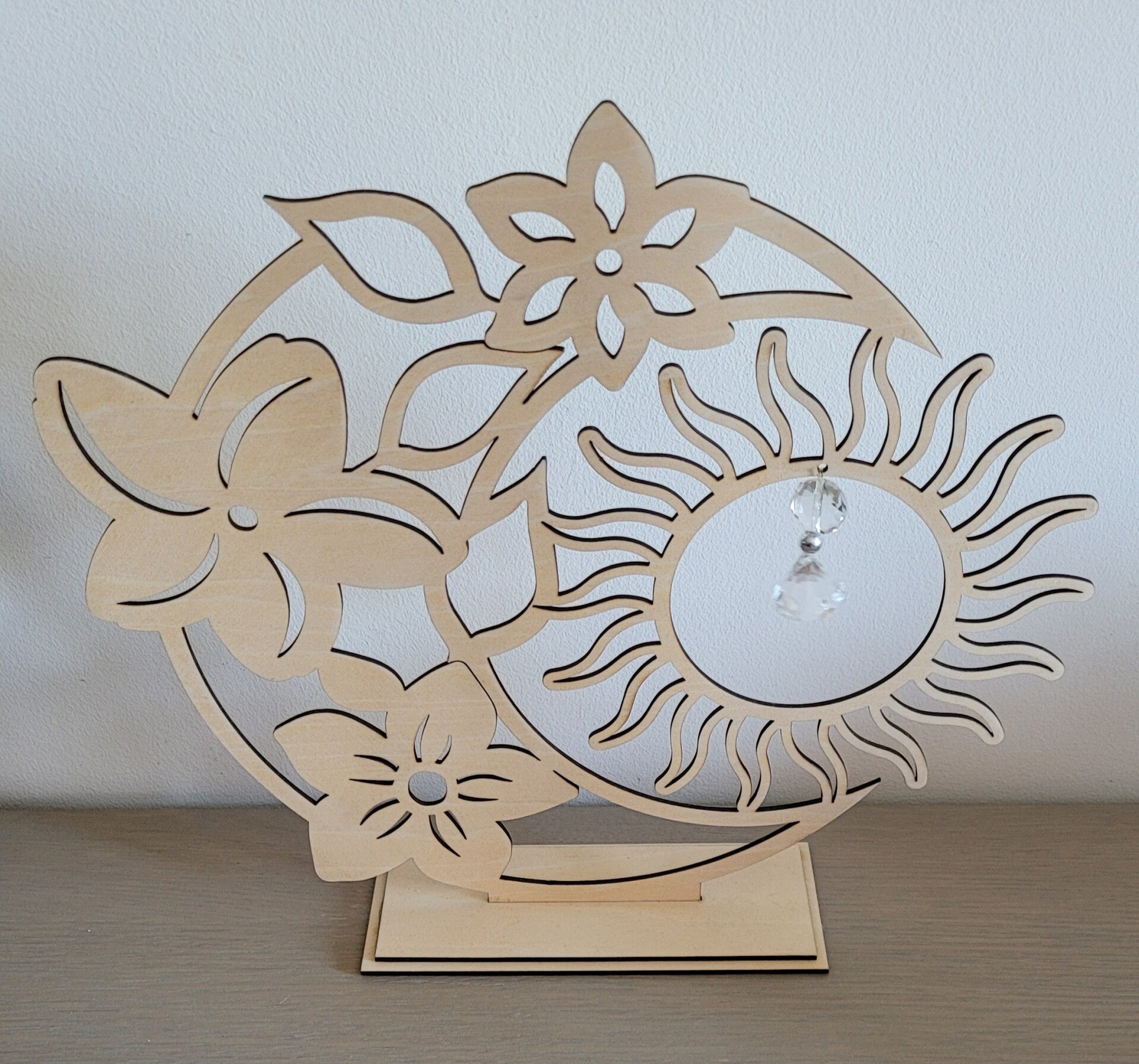 Décoration en bois représentant un soleil avec motif floral, découpée au laser et posée sur socle. Idéale pour apporter une touche naturelle et chaleureuse à votre intérieur.