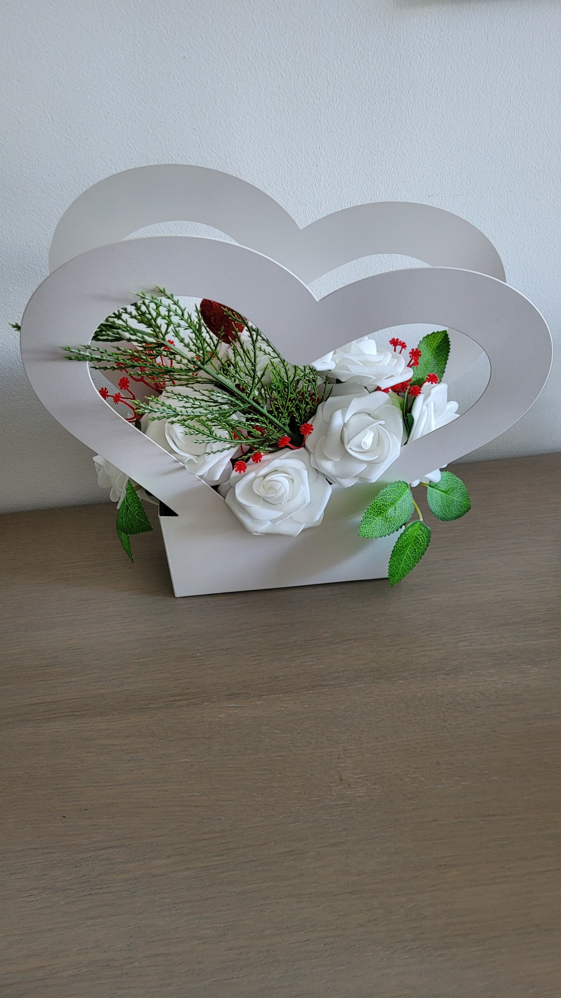 Offrez un cadeau plein de douceur et d’élégance avec cette magnifique boîte en forme de cœur garnie de fleurs en mousse.