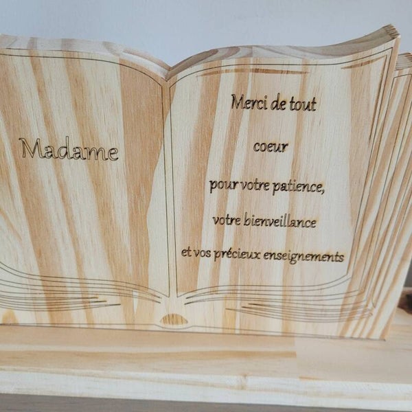 Ce support décoratif représente un livre ouvert avec un message gravé pour remercier une maîtresse, une ATSEM ou une nounou pour son accompagnement tout au long de l’année.